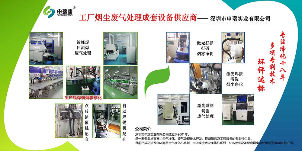 申瑞研發與生產的專業針對工業煙塵廢氣處理及成套設備,廣泛應用于激光加工、波峰焊、回流焊、點膠等領域,凈化率達到99.99%,是您環評環保達標的首選。